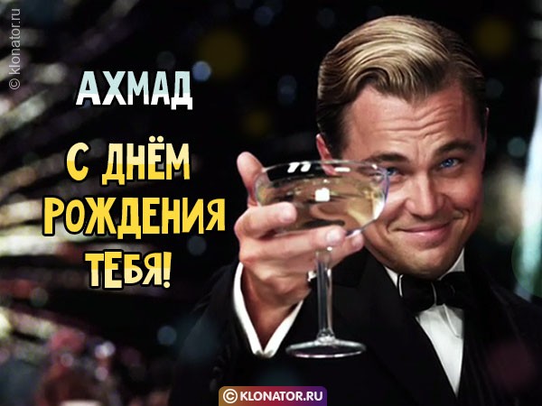 Бесплатные торжественные открытки, от команды «Клонатор.ру», идеально подходят, чтобы осчастливить человека, которого зовут Ахмад с Днем Рождения: Супругу, Парню, Крёстному, Детям, Зятю, Сослуживцу, Любимому, Дяде, Сыну, Коллеге, Мальчику, Мужчине, Боссу, Папе, Свёкру, Куму, Свату, Внуку, Дедуле, Руководителю, Племяннику, Учителю, Тестю, Братишке. Скачайте их на телефон, или сделайте пост на блоге, или форуме.