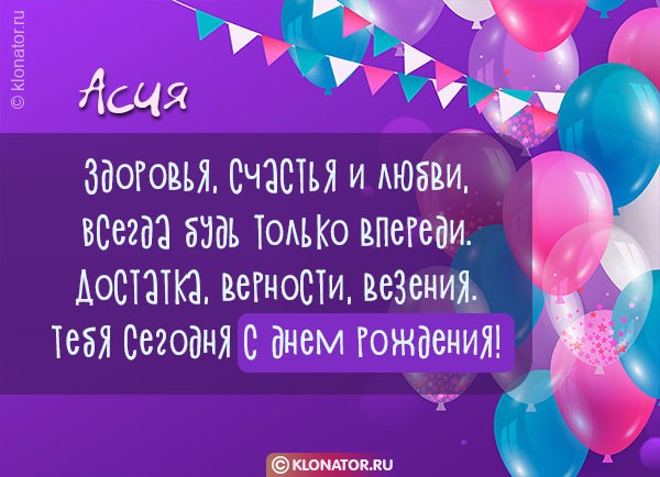 На носу Днюха твоей подруги? Подкрадывается Юбилей близкого человека? Не комплексуйте — у нас на сайте клонатор.ру вы обнаружите поздравительные картинки с именем Асия, которые прийдутся каждому. Красивые и оригинальные авторские картинки подойдут всем: знакомой, куме, учителю, приятельнице, однокурснице, коллеге, любовнице, любимой, сестрёнке, невестке, ребёнку, боссу, тёте, девушке, подруге, руководителю, дочке, жене, золовке, внучке, воспитательнице, однокласснице, девочке, крёстной, тёще. Пошлите их на мобильный, или расположите на форуме, или блоге — коды для вставки мы приготовили для вас.