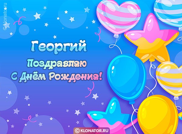 Порадуйте своих друзей и родных в День Рождения с помощью неизбитых оригинальных картинок с именем Георгий от онлайн-портала Клонатор.ру. Вы можете найти подходящую из новейшей коллекции прикольных открыток, которые подойдут под любой вкус и отношения. В нашем собрании имеются картинки для детей и взрослых с именем Георгий. Каждую открытку возможно скачать бесплатно на мобильный и послать имениннику, чтобы поздравить с юбилейной датой, или Днём Рождения.