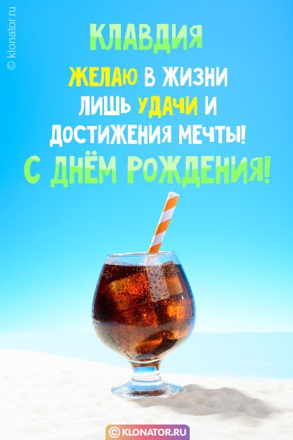 Приближается День Рождения лучшей подруги? Наступает Юбилейная дата родного человека? Не волнуйтесь — на нашем портале клонатор.ру вы найдете приветственные открытки с именем Клавдия, которые прийдутся любому человеку. Наши милые поздравительные открытки можно отправить всем: тёте, жене, невестке, приятельнице, девочке, тёще, однокурснице, учительнице, племяннице, девушке, любимой, воспитательнице, начальнице, сестрёнке, любовнице, золовке, свекрови, коллеге, ребёнку, знакомой, куме, лучшей подруге, женщине, дочери, внучке. Отправьте их на смартфон, или поместите на форуме, или блоге — коды для вставки мы сделали для вас.