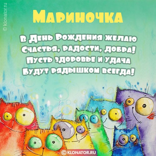 Не за горами Днюха лучшей подруги? Подкрадывается Юбилейная дата родного человека? Не переживайте — на нашем веб-ресурс klonator.ru вы найдете приветственные открытки с именем Мариночка, которые приглянутся каждому. Красивые и трогательные поздравительные открытки подойдут всем: лучшей подруге, любовнице, начальнице, дочери, женщине, жене, тёще, крёстной, внучке, свекрови, однокласснице, руководительнице, девушке, девочке, невестке, воспитательнице, тёте, учителю, приятельнице, знакомой, сестре, золовке, ребёнку, племяннице, любимой. Отправьте их на телефон, или разместите на форуме, или сайте — коды для вставки мы приготовили для вас.