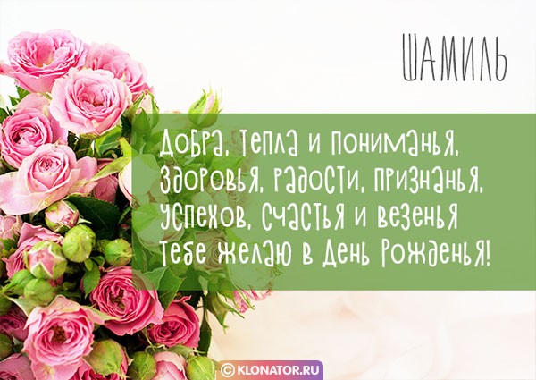 Порадуйте ваших приятелей и близких в День Рождения с помощью неизбитых авторских открыток с именем Шамиль от веб-ресурса «Клонатор.ру». Вы можете подобрать одну из тысяч поздравительных открыток, подходящих под любое настроение и дизайн. В прекрасном сборнике есть открытки для взрослых и детей с именем Шамиль. Каждую картинку возможно скачать бесплатно на телефон и подарить имениннику, чтобы поздравить с юбилейной датой, или Днём Рождения.