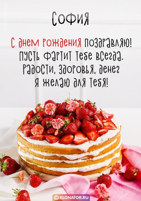 В ближайшее время День Рождения лучшей подруги? Подходит Юбилей родного человека? Не нервничайте — у нас на веб-ресурс klonator.ru вы найдете поздравительные картинки с именем София, которые понравятся любому имениннику. Наши оригинальные поздравительные открытки подойдут всем: свекрови, внучке, боссу, знакомой, воспитательнице, дочери, невестке, любимой, ребёнку, любовнице, руководительнице, тёще, однокласснице, золовке, учителю, жене, племяннице, куме, любимой, подруге, девушке, девочке, однокурснице, крёстной, приятельнице. Отправьте их на смартфон, или установите на форуме, или сайте — коды для вставки мы подготовили для вас.