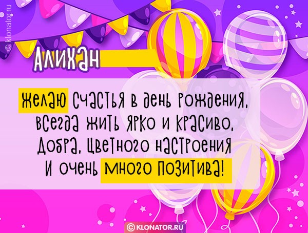 Поздравьте ваших приятелей и родных в День Рождения с помощью небанальных эксклюзивных картинок с именем Алихан от медиапортала klonator.ru. Вы можете подобрать одну из тысяч красивых открыток, которые подойдут под любой вкус и стиль. В нашем собрании имеются картинки для взрослых и детей с именем Алихан. Каждую открытку не возбраняется скачать бесплатно на мобильный телефон и подарить имениннику, чтобы поздравить с юбилейной датой, или Днём Рождения.
