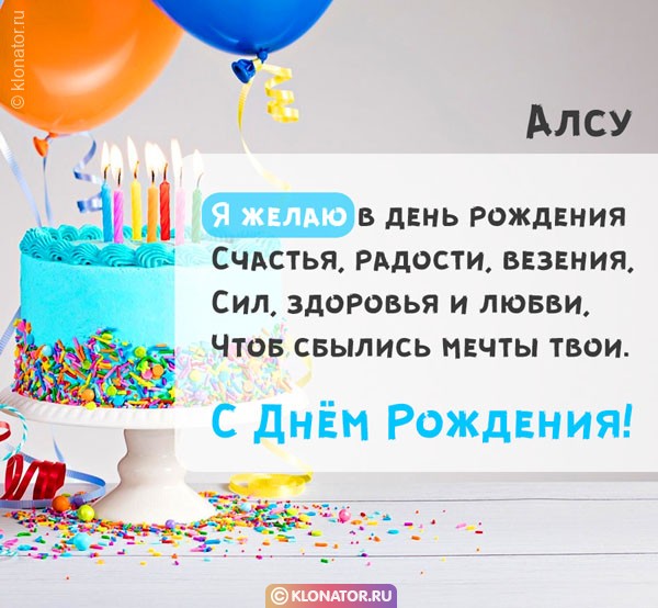 Поразите подружку, или близкого человека в День Рождения с именем Алсу картинкой, или голосовым пожеланием от от чистого сердца. С цветами и потешные, колоритные и нестандартные, у нас на интернет-сайте клонатор.ру любой подберёт крутую картинку, подобающую стилю виновницы праздника. Когда абонент примет от вас картинку, это 100% доставит хорошее чувство праздника, ведь забота завсегда ну очень любо-дорого. Также любую открытку несложно скачать бесплатно и вставить в блог, или форум.