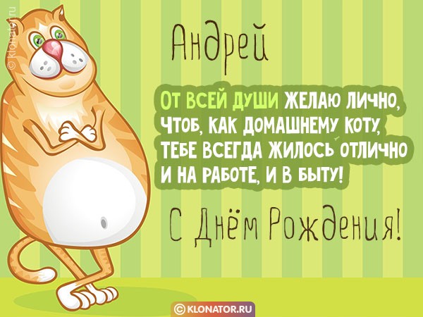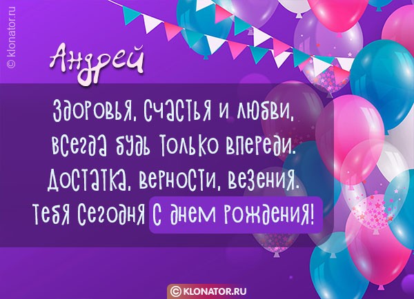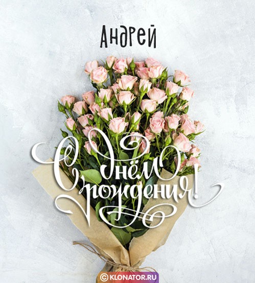 Бесплатные электронные картинки, от команды klonator.ru, хорошо подходят, чтобы обрадовать виновника торжества, которого зовут Андрей с Днем Рождения: Отцу, Сослуживцу, Крёстному, Парню, Другу, Мужу, Детям, Свату, Внуку, Дедуле, Брату, Мужчине, Коллеге, Тестю, Сыну, Мальчику, Зятю, Начальнику, Руководителю, Племяннику, Куму, Учителю, Свёкру, Любимому. Скачайте их на смартфон, или разместите на блоге, или форуме.