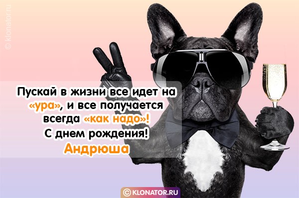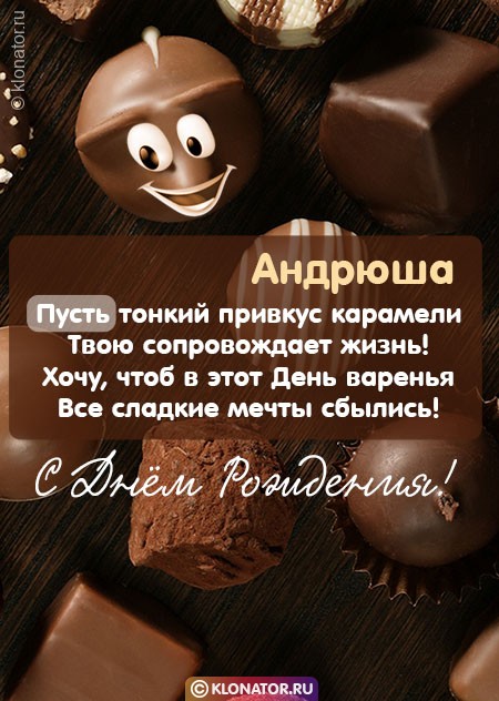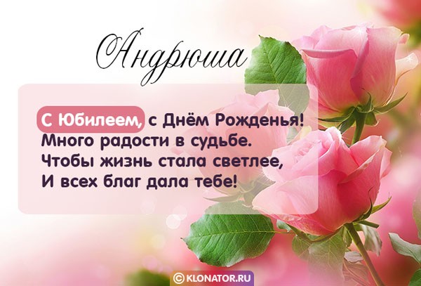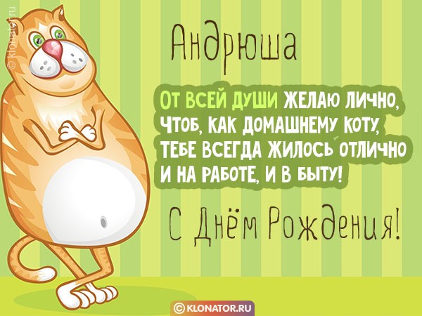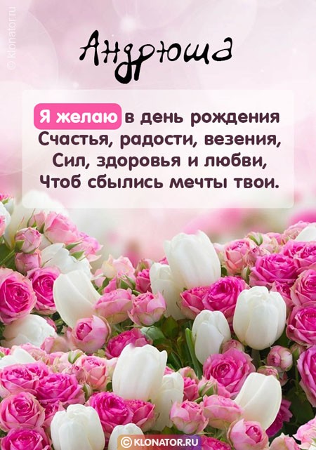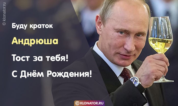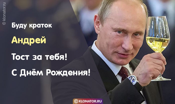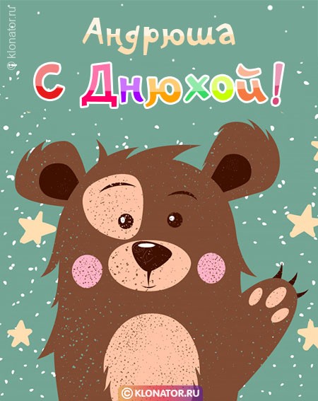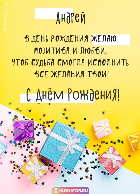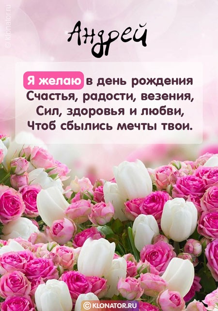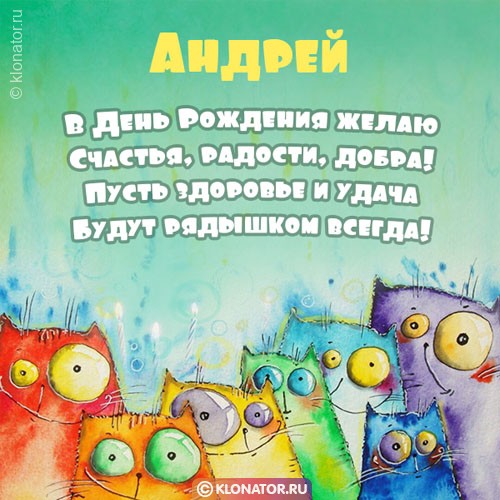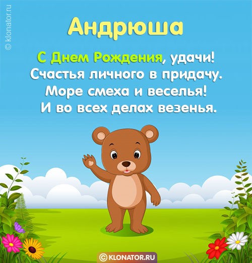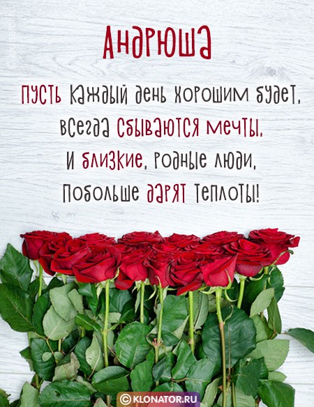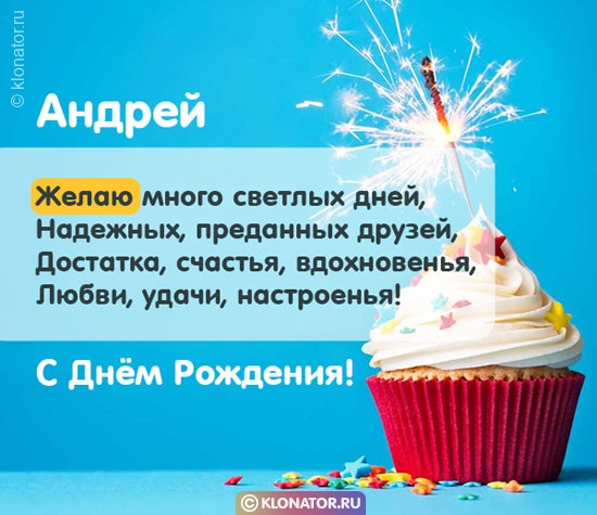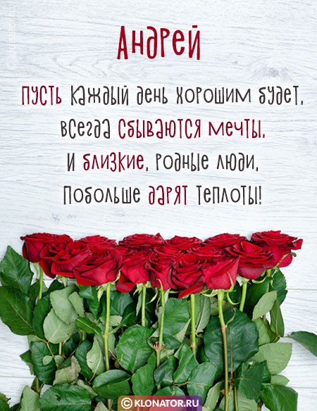 Особенные открытки и голосовые поздравления для имени Андрей от сайта «Клонатор.ру» имеется возможность мгновенно подарить на мобильный в любой онлайн-мессенджер, или социальную сеть сеть: Вайбер, Telegram, Ватсап, Facebook Messenger, Skype, Вконтакте, Одноклассники. У нас есть открытки для поздравления с праздничной датой: для детей, пожелания в прозе, сердцами, цветочными букетами, смайликами, четверостишьями, открытки с Путиным, свечками, для взрослых, фужерами шампанского, котиками, охапками роз, конфетами, подарками, тюльпанчиками, цветами, тортиками, шариками, с подписями, медведями и без сомнения все изображения сделаны с любовью.