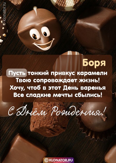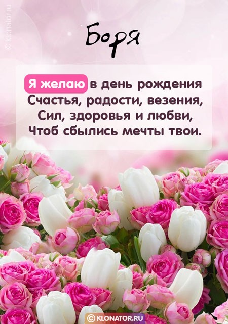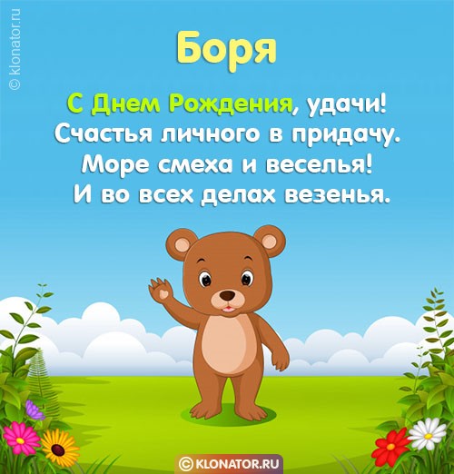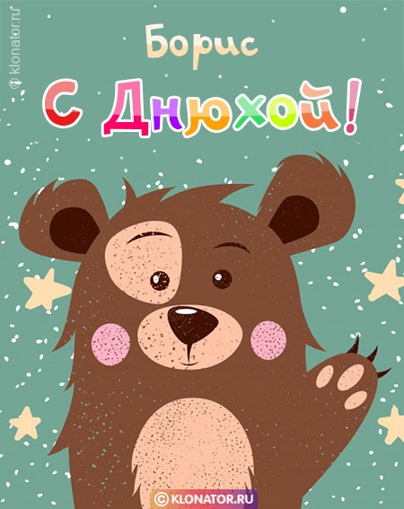 Эксклюзивные картинки и звуковые пожелания для имени Борис, Боря от команды Клонатор.ру имеется возможность сейчас же послать на мобильник в требующийся мессенджер, или социальную сеть сеть: Telegram, Скайп, VK, Facebook, Одноклассники, Viber, WhatsApp. У нас есть картинки для поздравления с праздничной датой: для взрослых, котами, охапками роз, цветочками, свечами, шампанским, детские, улыбками, с надписями, сердцами, тортиками, четверостишьями, букетами цветов, открытки с В.Путиным, от Леодардо Ди Каприо, подарками, поздравлениями своими словами, медвежатами, шарами, шоколадками и вне сомнения все фото открытки нарисованы от всего сердца.