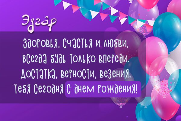 Уникальные картинки и голосовые пожелания для имени Эдгар от ресурса «Klonator.ru» можно безотлагательно отправить на мобильник в желаемый онлайн-мессенджер, или социальную сеть сеть: Facebook Messenger, WhatsApp, Одноклассники, Скайп, Вконтакте, Viber, Telegram. В нашей подборке картинки для отправки с праздничной датой: взрослому, пожелания в прозе, тюльпанами, конфетами, шарами, открытки с Путиным, тортиками, подарками, шампанским, котиками, цветочными букетами, свечами, розочками, от Леодардо Ди Каприо, сердцами, с надписями, цветочками, ребёнку, поэзией, смайлами и в обязательном порядке все электронные открытки разработаны от всей души.