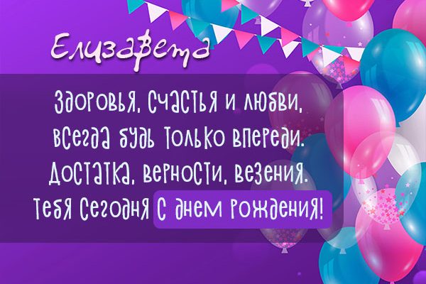 Восхитительные картинки и аудио пожелания с именем Елизавета от интернет-сайта Klonator.ru можно в одно мгновение послать на мобильный телефон в любой мессенджер: ватсап, телеграмм, вайбер. У нас есть открытки для поздравления с Юбилеем и Днём Рождения: мягкими игрушками, букетами цветов, розочками, смайлами, стихами, с цветами, воздушными шариками, котами, поздравлениями в прозе, тортами, для детей, от Ди Каприо, картинки с президентом, тюльпанами, подарками, с надписями, собаками и обязательно очень хорошенькие.
