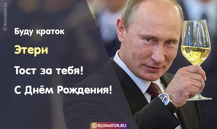 Смешные открытки и голосовые поздравления для имени Этери от портала клонатор.ру вы можете отправить на мобильный телефон в любой мессенджер: телеграмм, ватсап, вайбер. У нас есть праздничные картинки с Днём Рождения и Юбилеем: поздравлениями в прозе, для детей, открытки от Путина, смайлами, мягкими игрушками, тортиками, шоколадками, собаками, с цветами, воздушными шарами, медвежатами, с надписями, подарками, розами, букетами цветов, от Ди Каприо, котиками и просто самые юмористичные.