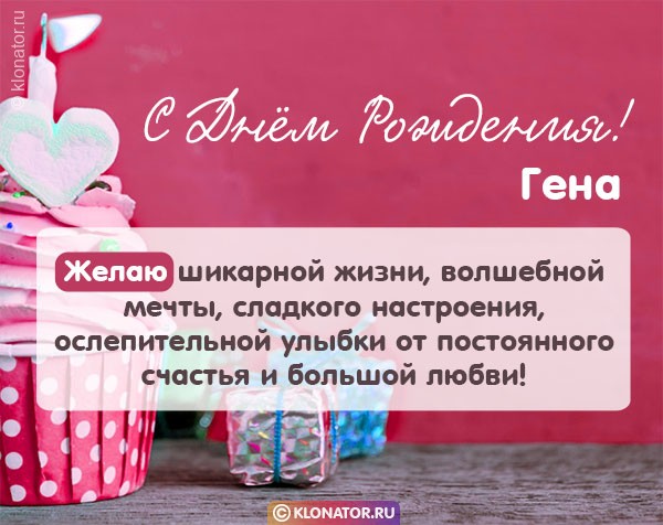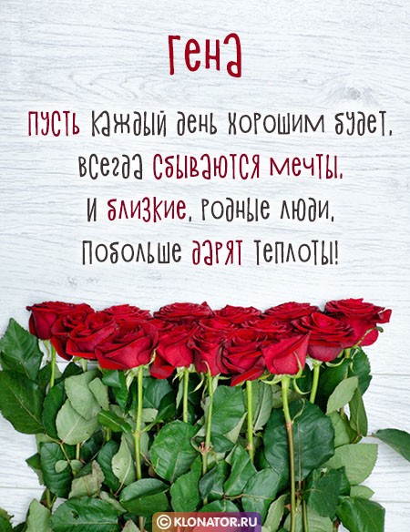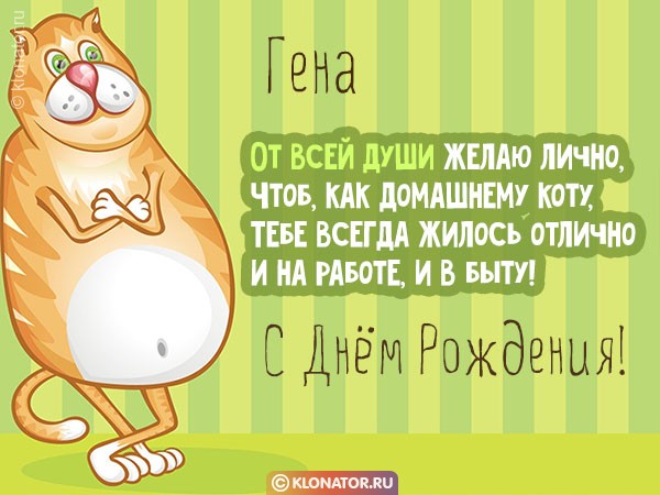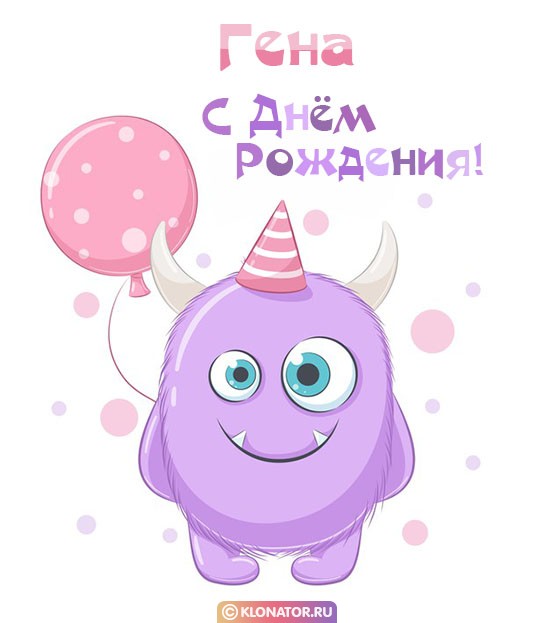 Бесплатные поздравительные открытки, от программистов klonator.ru, прекрасно подходят для того, чтобы позабавить человека, которого зовут Геннадий, Гена с Днем Рождения: Племяше, Сыночку, Куму, Другу, Крёстному, Супругу, Коллеге, Руководителю, Дяде, Свёкру, Отцу, Преподавателю, Тестю, Зятю, Брату, Мальчику, Любимому, Ребёнку, Парню, Внуку, Сослуживцу, Начальнику, Дедушке, Свату. Скачайте бесплатно на мобильный, или расположите на блоге, или форуме.