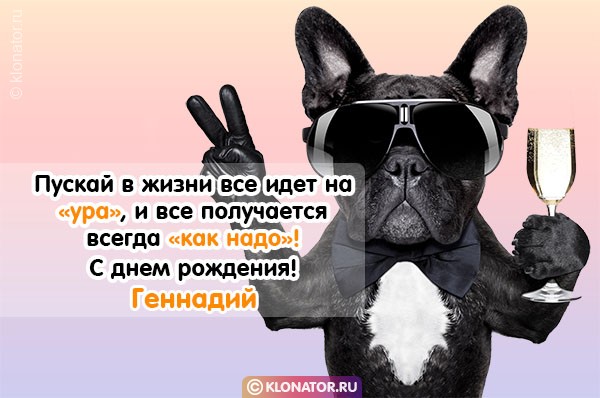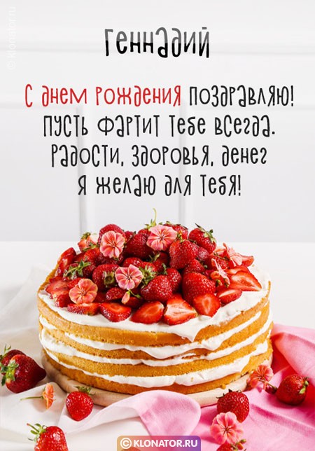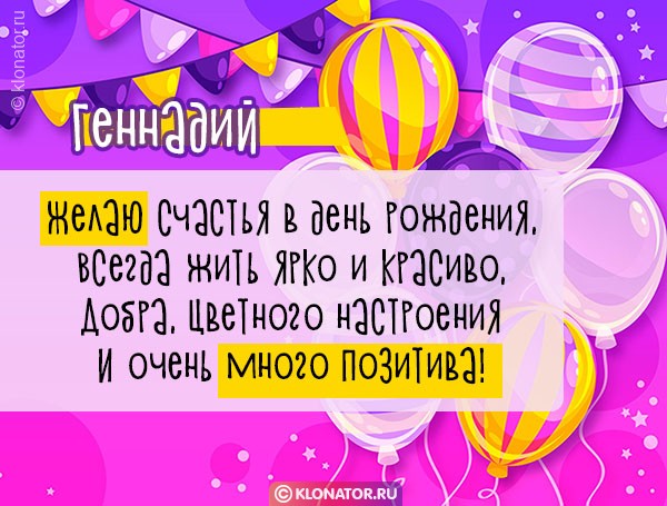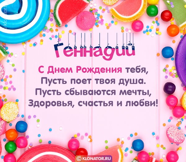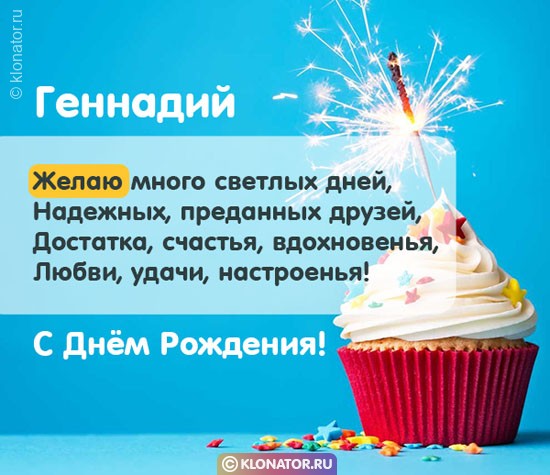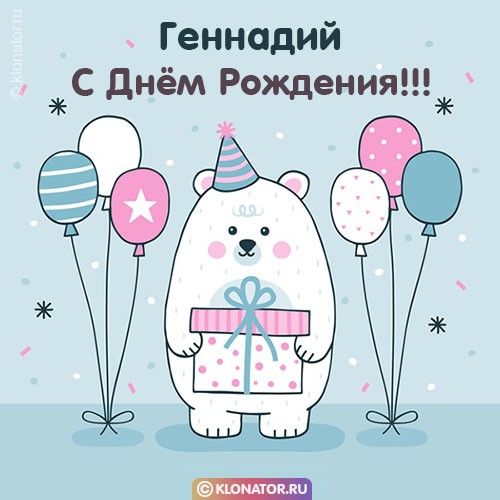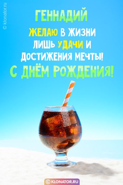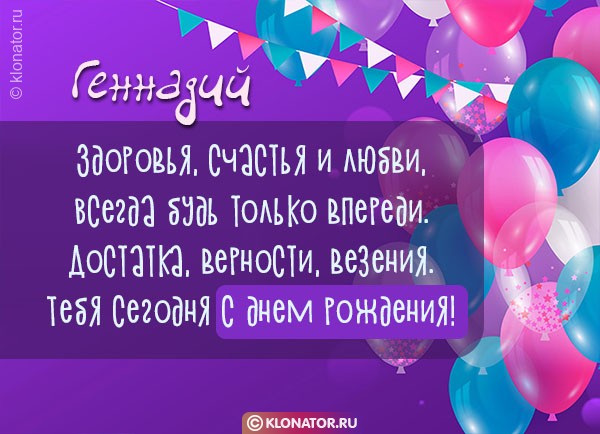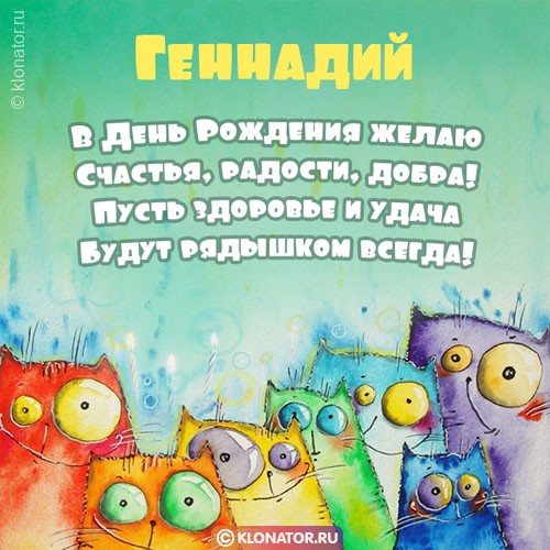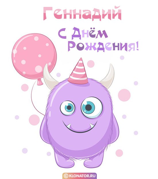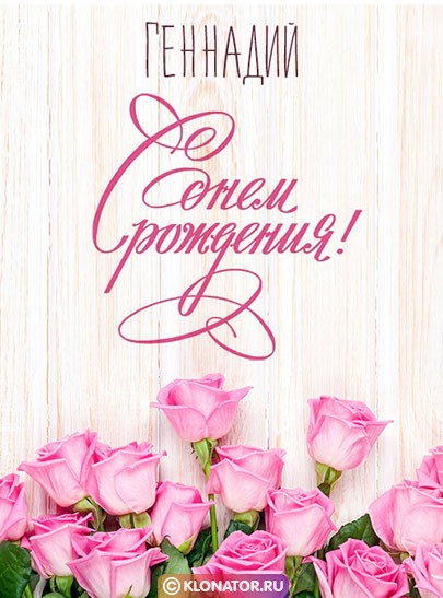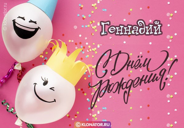 Обрадуйте ваших друзей и близких в День Рождения посредством поздравительных дизайнерских открыток с именем Геннадий от медиапортала Клонатор.ру. Вы можете найти приглянувшуюся из сотен прикольных открыток, подходящих под любой вкус и стиль. В прекрасном сборнике вы найдёте картинки для детей и взрослых с именем Геннадий. Каждую картинку имеется возможность скачать бесплатно на мобильный телефон и отправить любимому человеку, чтобы поздравить с Днём Рождения, или юбилеем.