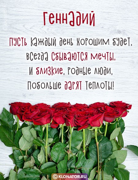 Уморительный открытки и звуковые поздравления для имени Геннадий, Гена от портала klonator.ru можно немедля подарить на мобильный в необходимый мессенджер, или социальную сеть сеть: WhatsApp, Вайбер, Одноклассники, Facebook, VK, Скайп, Telegram. Имеются картинки для отправки с торжественной датой: картинки с В.Путиным, тюльпанчиками, воздушными шариками, для взрослых, тортами, пожелания в прозе, букетами цветов, розами, сердечками, с надписями, свечками, медведями, конфетками, цветами, поэзией, смайлами, котиками, от Ди Каприо, детские, фужерами шампанского и бесспорно все фото открытки разработаны от души.