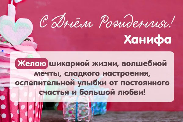 Не за горами Днюха твоей подруги? Подкрадывается Юбилей близкого человека? Не беспокойтесь — у нас на сайте klonator.ru вы найдете приветственные открытки с именем Ханифе, которые понравятся любому имениннику. Наши трогательные поздравительные картинки можно скачать всем: приятельнице, однокурснице, ребёнку, начальнице, невестке, дочери, коллеге, жене, крёстной, однокласснице, тёте, воспитательнице, руководительнице, любимой, любимой, любовнице, тёще, знакомой, куме, золовке, девочке, сестре, девушке, женщине, внучке. Скачайте их на телефон, или разместите на форуме, или сайте — коды для вставки мы сделали для вас.