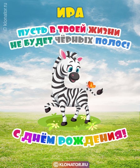 В скором времени Днюха твоей подруги? Надвигается Юбилейная дата родного человека? Не нервничайте — на нашем сайте klonator.ru вы обнаружите поздравительные картинки с именем Ира, которые прийдутся любому человеку. Наши милые поздравительные открытки подойдут всем: любовнице, девочке, золовке, свекрови, подружке, приятельнице, девушке, крёстной, внучке, однокурснице, тёще, невестке, куме, тёте, воспитательнице, знакомой, ребёнку, сестре, племяннице, учителю, однокласснице, начальнице, любимой, коллеге, руководительнице. Пошлите их на смартфон, или поместите на форуме, или сайте — коды для вставки мы подготовили для вас.