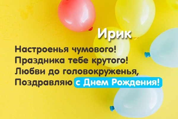 Поздравьте ваших приятелей и близких в День Рождения при помощи поздравительных эксклюзивных картинок с именем Ирик от ресурса Клонатор.ру. Вы можете найти приглянувшуюся из тысяч поздравительных открыток, которые подойдут под любое настроение и цвет. В нашем собрании есть картинки для детей и взрослых с именем Ирик. Любую картинку допускается скачать бесплатно на мобильный телефон и подарить имениннику, чтобы поздравить с Днём Рождения, или юбилейной датой.