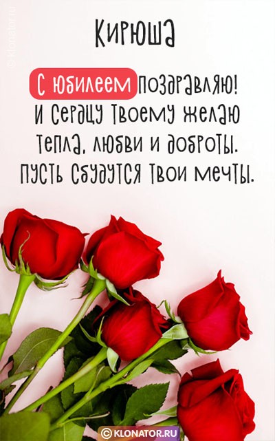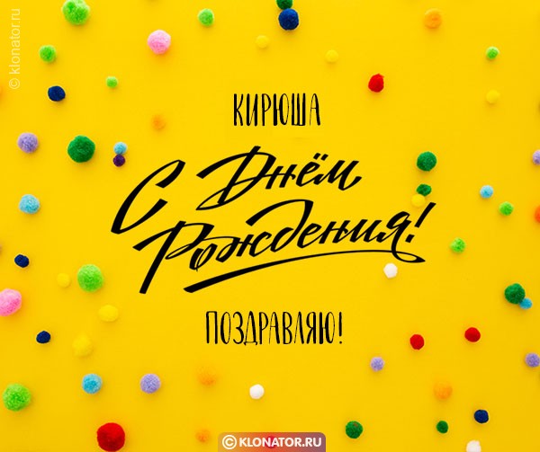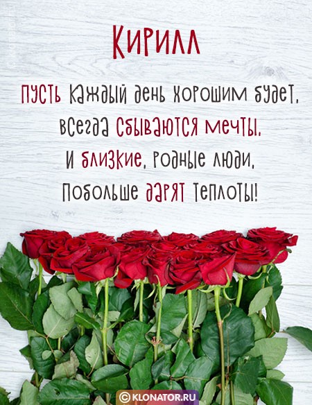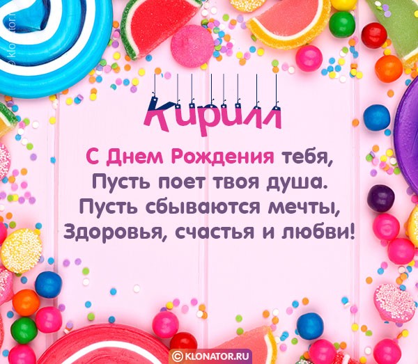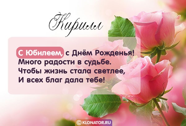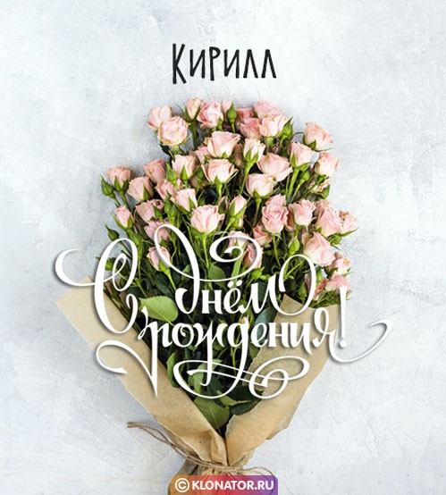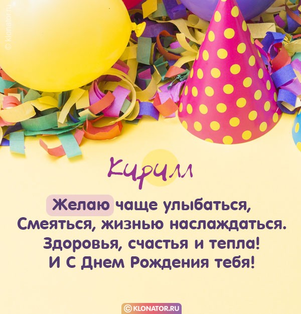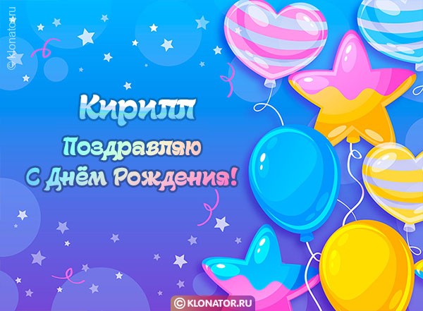 Бесплатные электронные открытки, от дизайнеров «klonator.ru», идеально подходят, чтобы поприветствовать именинника, которого зовут Кирилл с Юбилеем и Днём Рождения: Руководителю, Другу, Мужу, Любимому, Мужчине, Ребёнку, Брательнику, Сотруднику, Племяннику, Зятю, Отцу, Дяде, Парню, Боссу, Куму, Сыночку, Свату, Свёкру, Тестю, Мальчику, Сослуживцу, Дедуле, Крёстному, Учителю. Скачайте их на смартфон, или сделайте пост на форуме, или блоге.