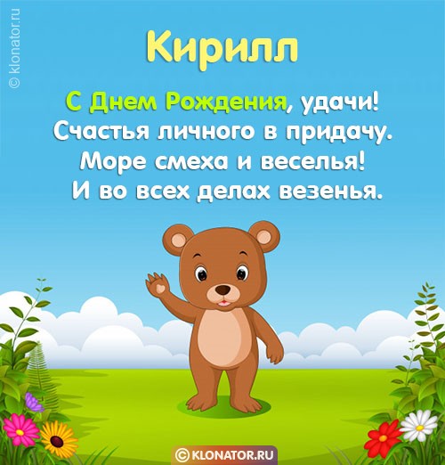 Уморительный открытки и звуковые пожелания для имени Кирилл от ресурса «Клонатор.ру» вы можете сразу же отправить на смартфон в необходимый онлайн-мессенджер, или соц. Сеть: Вайбер, Одноклассники, Вконтакте, Facebook, Ватсап, Skype, Телеграмм. У нас есть открытки для отправки с торжественной датой: тюльпанами, медведями, шампанским, котиками, с надписями, смайлами, пожелания в прозе, стишками, тортами, от Ди Каприо, свечами, цветочными букетами, конфетками, воздушными шариками, розами, открытки с президентом Путиным, цветочками, детские, подарками, сердцами и ясное дело все изображения нарисованы с любовью.