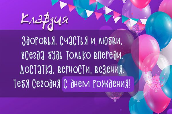 Приближается День Рождения лучшей подруги? Наступает Юбилейная дата родного человека? Не волнуйтесь — на нашем портале клонатор.ру вы найдете приветственные открытки с именем Клавдия, которые прийдутся любому человеку. Наши милые поздравительные открытки можно отправить всем: тёте, жене, невестке, приятельнице, девочке, тёще, однокурснице, учительнице, племяннице, девушке, любимой, воспитательнице, начальнице, сестрёнке, любовнице, золовке, свекрови, коллеге, ребёнку, знакомой, куме, лучшей подруге, женщине, дочери, внучке. Отправьте их на смартфон, или поместите на форуме, или блоге — коды для вставки мы сделали для вас.