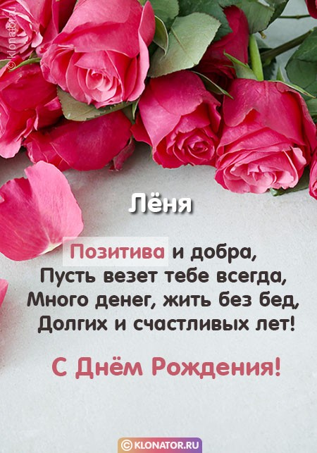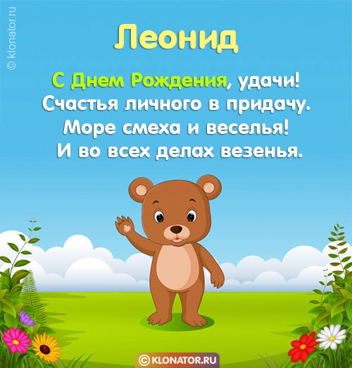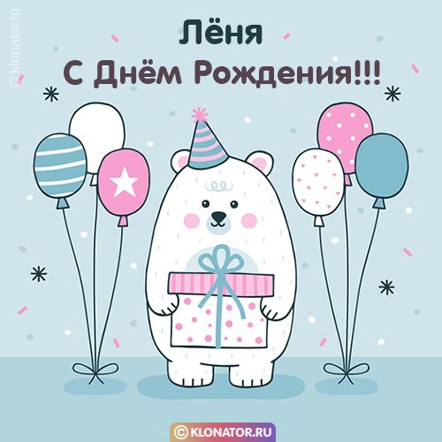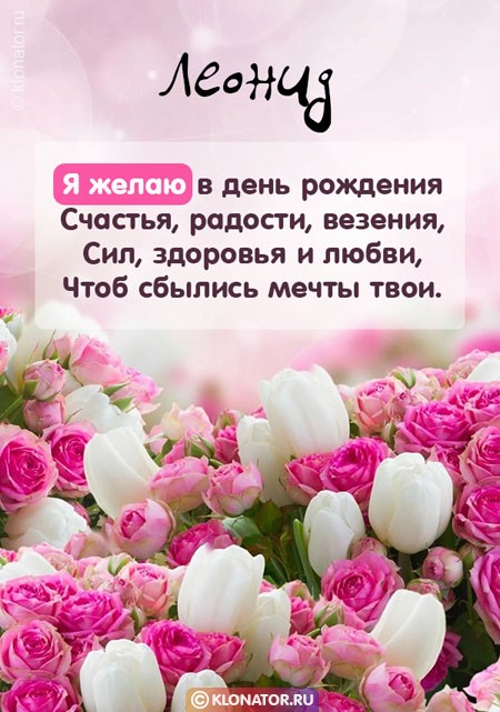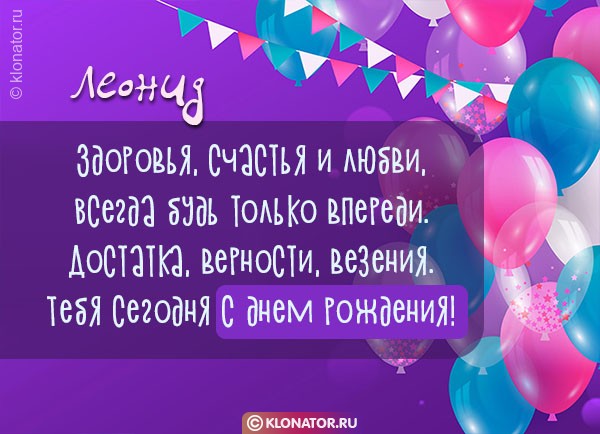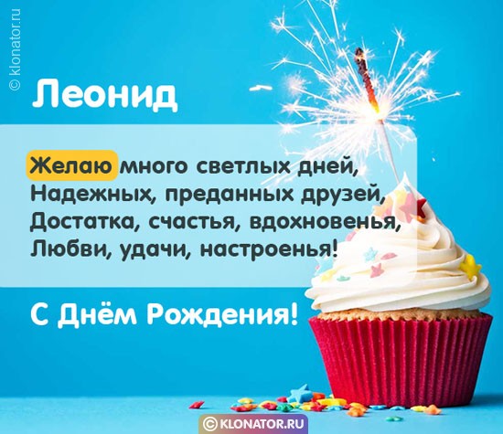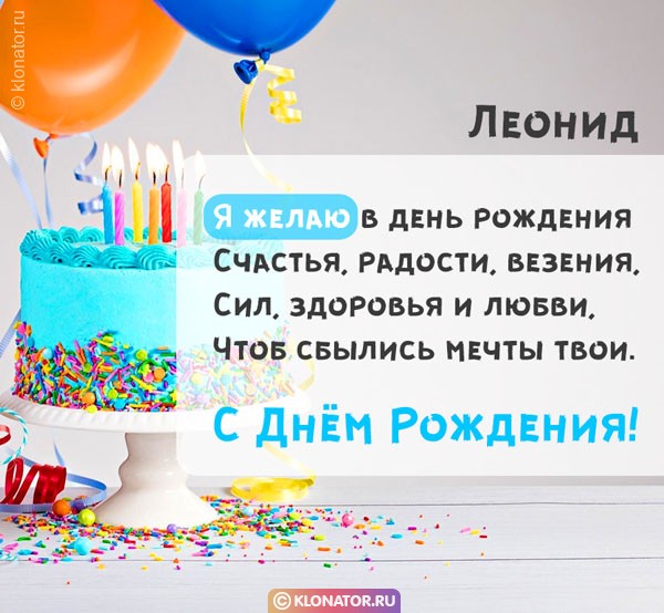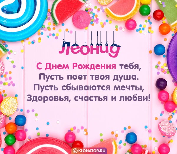 Прекрасные открытки и звуковые поздравления для имени Лёня, Леонид от портала klonator.ru вы можете не откладывая презентовать на мобильник в любой мессенджер, или соц. Сеть: Telegram, Одноклассники, Facebook, Ватсап, VK, Скайп, Viber. В нашей подборке картинки для поздравления с торжественной датой: конфетками, воздушными шариками, тюльпанами, взрослому, шампанским, открытки с президентом Путиным, медвежатами, букетами цветов, для детей, с подписями, поэзией, поздравлениями в прозе, от Ди Каприо, сердечками, презентами, свечами, котами, розами, смайлами, тортиками и даём гарантию все они нарисованы от всей души.