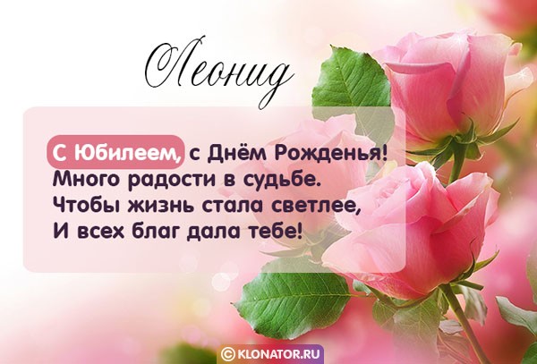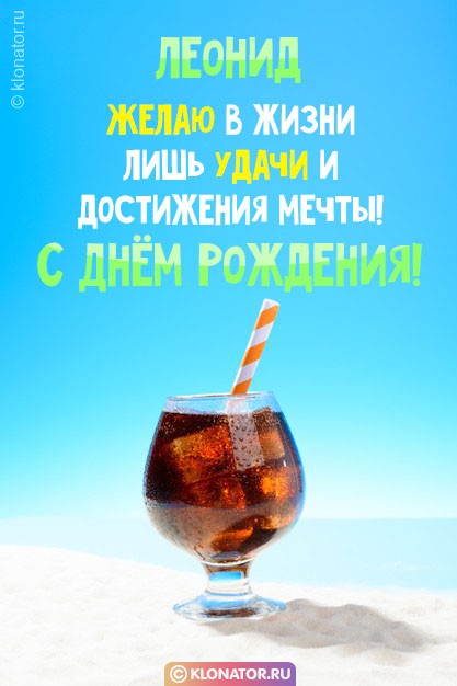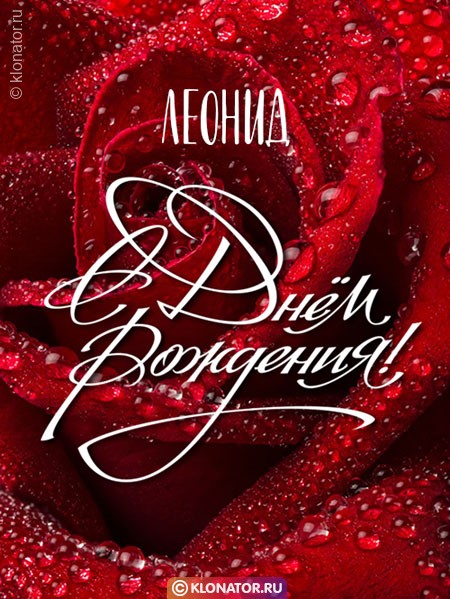 Бесплатные поздравительные открытки, от команды klonator.ru, хорошо подходят, чтобы позабавить человека, которого зовут Леонид, Лёня с Юбилеем и Днём Рождения: Начальнику, Папе, Дедуле, Свёкру, Учителю, Племяше, Мужчине, Крёстному, Коллеге, Другу, Внуку, Любимому, Руководителю, Зятю, Мальчику, Дяде, Свату, Парню, Сослуживцу, Мужу, Куму, Сыночку, Братишке, Детям. Скачайте бесплатно на телефон, или установите на сайте, или форуме.