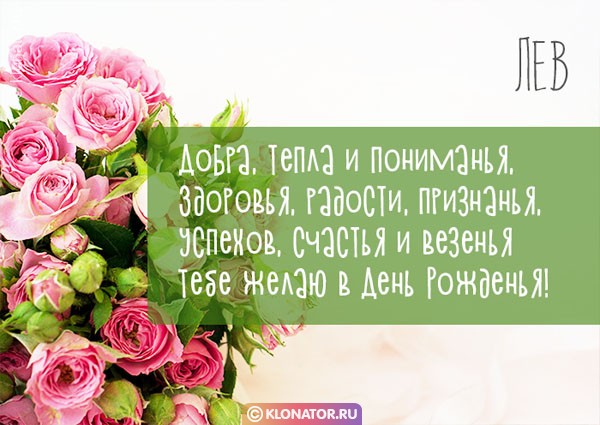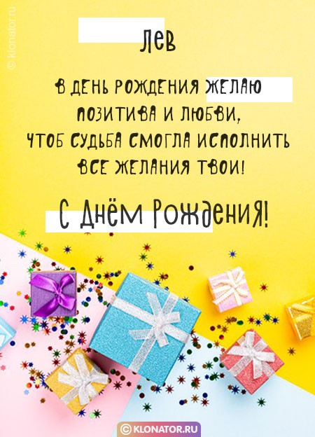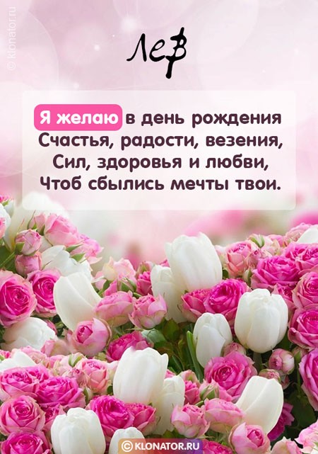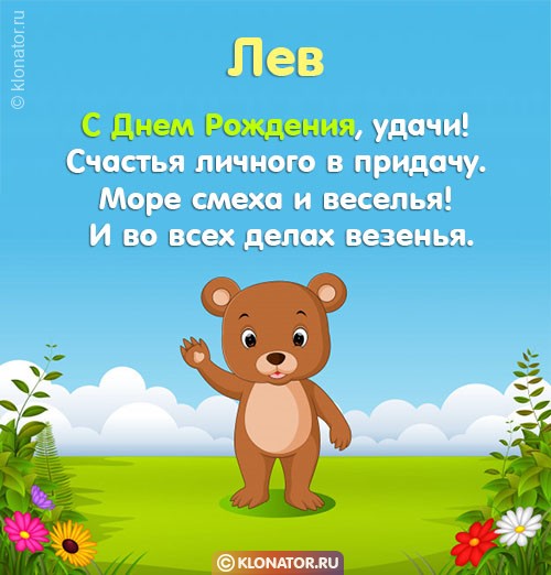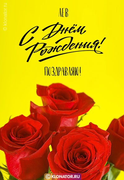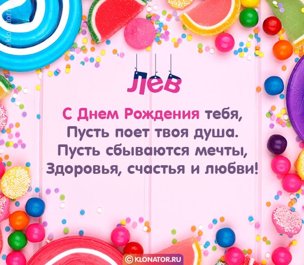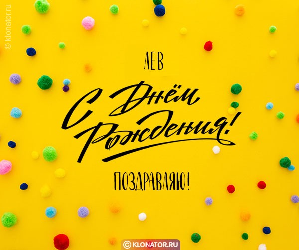 Бесплатные электронные открытки, от мастеров «klonator.ru», отлично подходят для того, чтобы обрадовать виновника торжества по имени Лев, Лёва с Днем Рождения: Учителю, Любимому, Дедушке, Мужу, Ребёнку, Зятю, Куму, Брату, Руководителю, Боссу, Свёкру, Коллеге, Племяше, Другу, Крёстному, Внуку, Свату, Мужчине, Сыну, Папе, Дяде, Мальчику, Парню, Тестю. Скачайте их на мобильник, или расположите на сайте, или форуме.