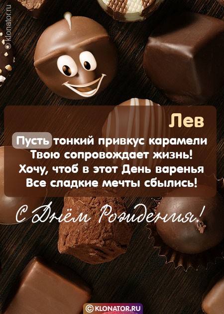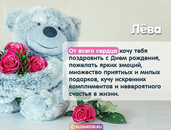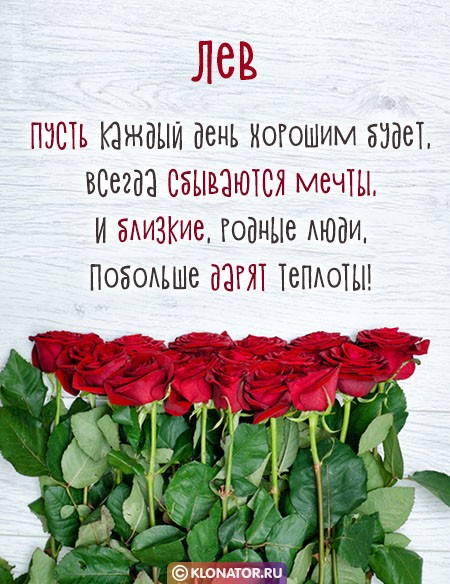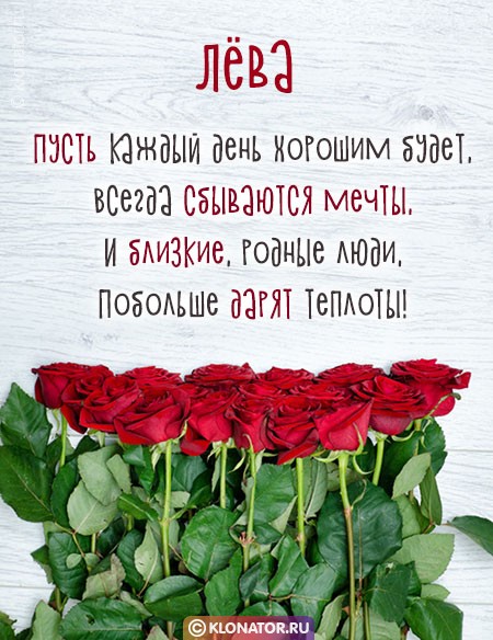 Особенные картинки и музыкальные пожелания для имени Лев, Лёва от коллектива klonator.ru имеется возможность тут же подарить на мобильник в требующийся мессенджер, или соц. Сеть: Viber, Одноклассники, Телеграмм, Скайп, WhatsApp, VK, Facebook Messenger. В большой коллекции открытки для поздравления с праздничной датой: от Ди Каприо, пожелания в прозе, смайлами, сюрпризами, букетами цветов, шоколадками, тортиками, четверостишьями, картинки с президентом Путиным, охапками роз, фужерами шампанского, цветочками, шарами, медведями, котейками, для взрослых, ребёнку, свечами, тюльпанами, с подписями и конечно все изображения сделаны от всей души.