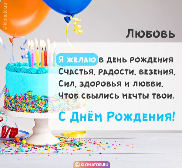 Порадуйте любимого человека в День Рождения с именем Любовь картинкой от от чистого сердца. Разноцветные и презабавные, красноречивые и дизайнерские, на нашем суперсайте klonator.ru посетитель отыщет изумительную картинку, которая соответствует образу именинницы. Когда адресат получит поздравительную открытку, это бесспорно обеспечит отличное настроение, как-никак внимательность в любое время более чем сердечно. Также каждую открытку можно скачать бесплатно и вставить в форум, или сайт.