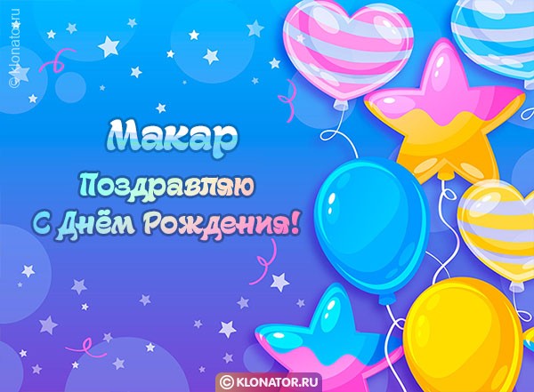 Поприветствуйте своих приятелей и близких в День Рождения при помощи креативных эксклюзивных картинок с именем Макар от портала klonator.ru. Вы можете найти одну из сотен красивых открыток, подходящих под любое настроение и дизайн. В нашем сборнике вы подберёте открытки для взрослых и детей с именем Макар. Каждую открытку не возбраняется скачать бесплатно на смартфон и отправить близкому человеку, чтобы поздравить с Днём Рождения, или юбилейной датой.
