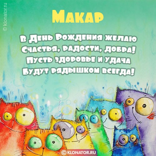 Бесплатные поздравительные картинки, от дизайнеров klonator.ru, идеально подходят, чтобы позабавить именинника, которого зовут Макар с Днем Рождения: Свату, Зятю, Мужчине, Мальчику, Тестю, Племяннику, Дедушке, Дяде, Свёкру, Сослуживцу, Брату, Преподавателю, Куму, Детям, Супругу, Боссу, Парню, Руководителю, Крёстному, Отцу, Сотруднику, Сыночку, Другу, Любимому. Скачайте их на смартфон, или установите на форуме, или блоге.