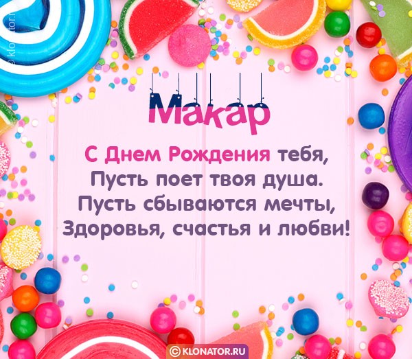Крутые открытки и аудио поздравления для имени Макар от ресурса «Клонатор.ру» возможно моментально презентовать на мобильник в любой онлайн-мессенджер, или соц. Сеть: Вайбер, Facebook Messenger, VK, Одноклассники, Skype, Ватсап, Telegram. У нас есть картинки для поздравления с праздничной датой: фужерами шампанского, букетами цветов, от Леодардо Ди Каприо, поздравлениями своими словами, сладостями, картинки с Путиным, конфетами, медвежатами, цветочками, улыбками, розочками, для взрослых, шариками, сердечками, стишками, детям, котейками, свечами, тюльпанами, с надписями и так или иначе все изображения созданы с любовью.