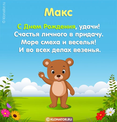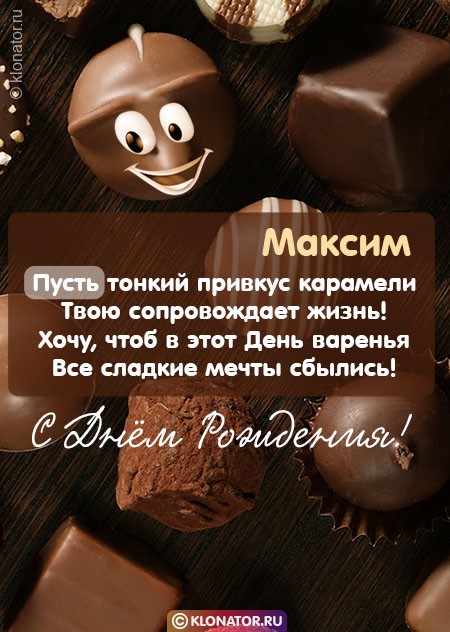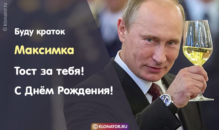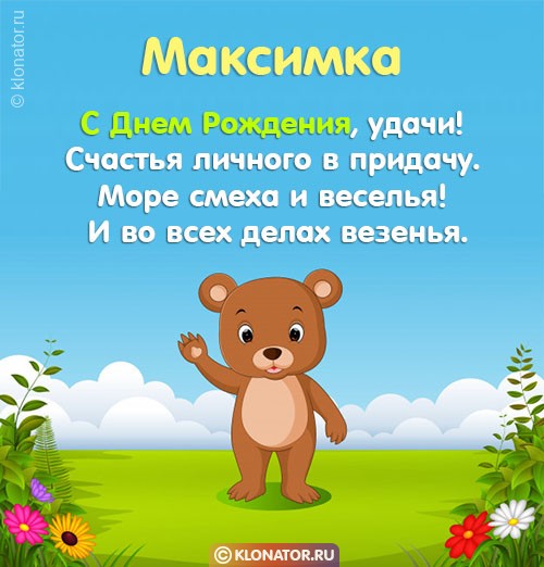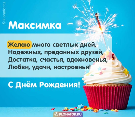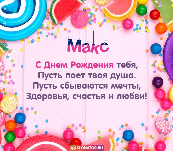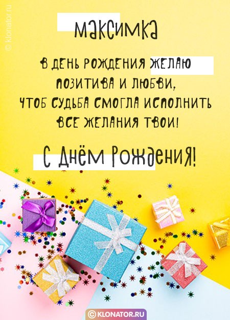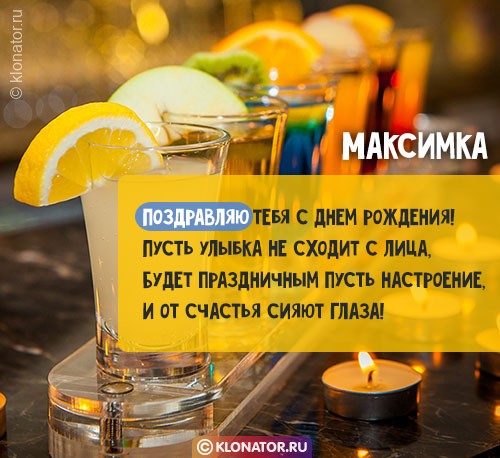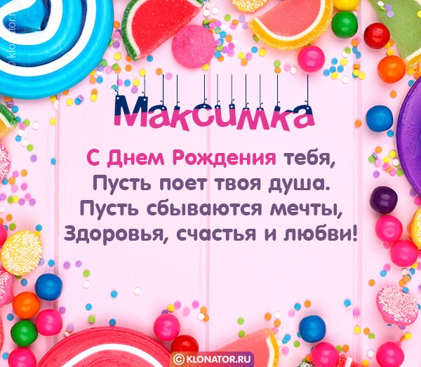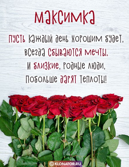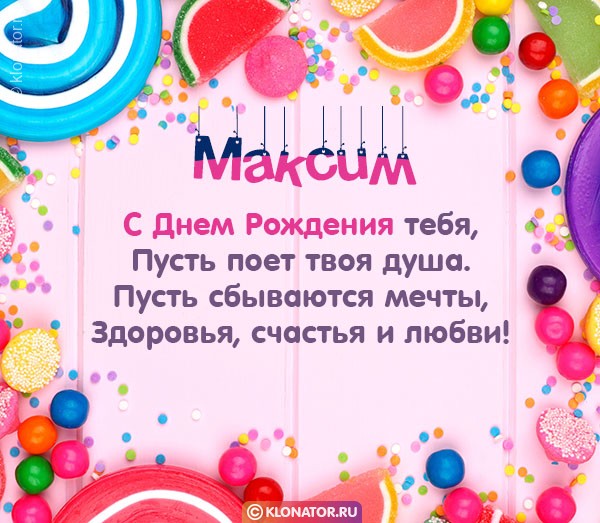 Особенные открытки и голосовые пожелания для имени Максим, Максимка, Макс от портала «Клонатор.ру» вы можете сейчас же подарить на смартфон в желаемый мессенджер, или соц. Сеть: VK, Facebook, Skype, Telegram, WhatsApp, Viber, Одноклассники. Имеются картинки для поздравления с праздничной датой: пожелания в прозе, подарками, улыбками, мишками, охапками роз, конфетками, фужерами шампанского, сладостями, воздушными шариками, взрослому, сердцами, поэзией, картинки с Путиным, котейками, цветами, свечами, для детей, цветочными букетами, с подписями, от Леодардо Ди Каприо и гарантированно все они созданы от всей души.