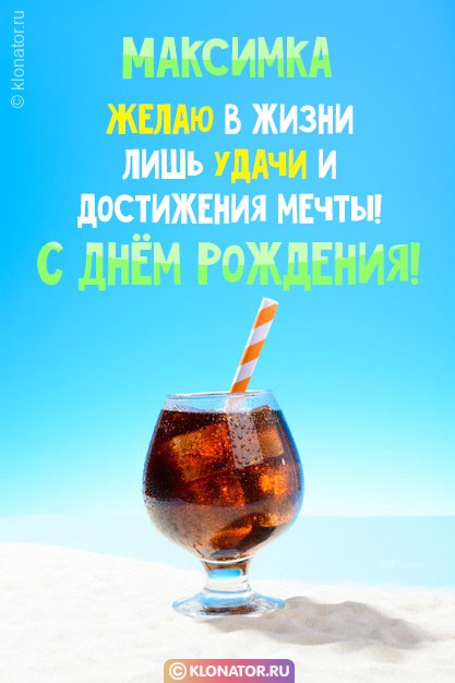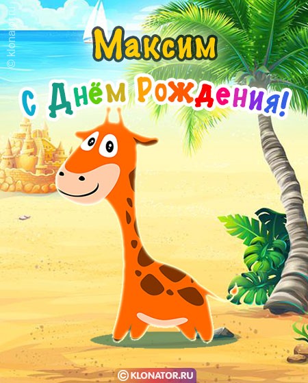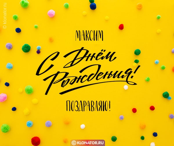 Обрадуйте своих друзей и близких в День Рождения посредством нетривиальных дизайнерских открыток с именем Максим от портала Клонатор.ру. Можно подобрать подошедшую из сотен поздравительных открыток, которые подойдут под любое настроение и отношения. В прекрасном сборнике есть картинки для детей и взрослых с именем Максим. Каждую открытку имеется возможность скачать бесплатно на мобильный и послать имениннику, чтобы поздравить с Днём Рождения, или юбилейной датой.