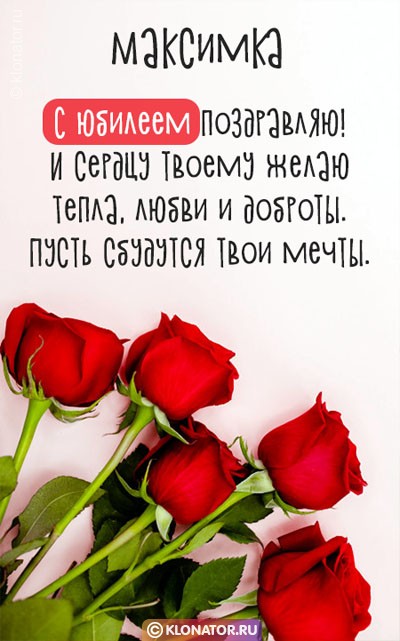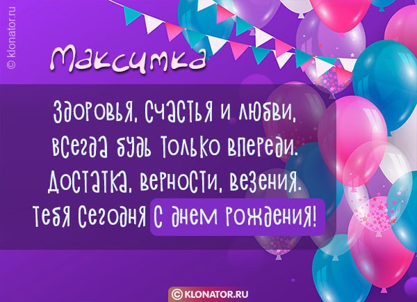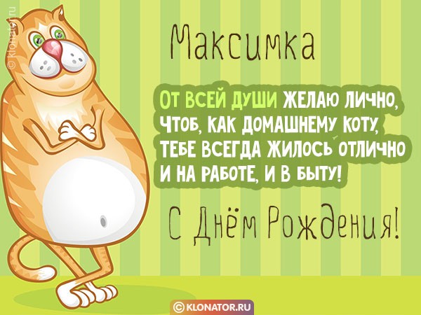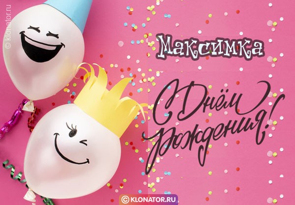 Бесплатные торжественные открытки, от дизайнеров «Клонатор.ру», хорошо подходят, чтобы позабавить виновника торжества, которого зовут Максим, Макс, Максимка с Днём Рождения и Юбилеем: Сотруднику, Учителю, Боссу, Руководителю, Мужу, Зятю, Дяде, Сыночку, Брательнику, Парню, Дедушке, Свату, Племяше, Мальчику, Папе, Тестю, Куму, Крёстному, Свёкру, Любимому, Сослуживцу, Другу, Детям, Внуку. Скачайте бесплатно на телефон, или расположите на блоге, или форуме.