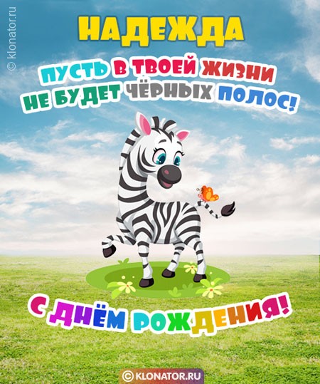 На днях Днюха лучшей подруги? Подбирается Юбилейная дата родного человека? Не тревожьтесь — на нашем портале клонатор.ру вы найдете поздравительные картинки с именем Надежда, которые понравятся любому человеку. Красивые и оригинальные поздравительные открытки можно скачать всем: однокласснице, любимой, куме, однокурснице, любимой, любовнице, девушке, директрисе, тёще, подружке, тёте, женщине, знакомой, приятельнице, племяннице, внучке, сестре, руководителю, дочке, коллеге, девочке, жене, свекрови, воспитателю, невестке. Отправьте их на мобильный, или поместите на форуме, или сайте — коды для вставки мы подготовили для вас.