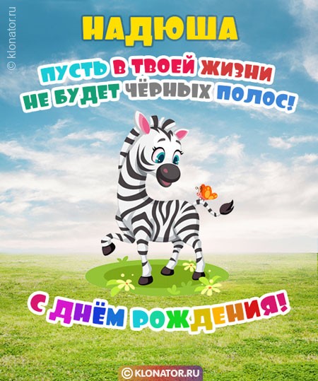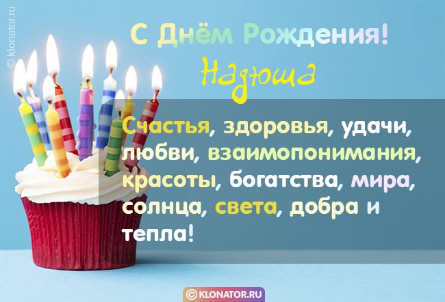 На днях День Рождения твоей подруги? Надвигается Юбилейная дата родного человека? Не комплексуйте — у нас на веб-ресурс клонатор.ру вы найдете поздравительные открытки с именем Надюша, которые прийдутся каждому. Красивые и трогательные авторские картинки можно скачать всем: коллеге, невестке, свекрови, воспитательнице, женщине, ребёнку, директрисе, дочке, куме, племяннице, золовке, сестре, любимой, учительнице, крёстной, приятельнице, девушке, однокурснице, однокласснице, тёще, внучке, руководителю, любовнице, любимой, девочке. Отправьте их на мобильник, или поместите на форуме, или блоге — коды для вставки мы уже сделали для вас.