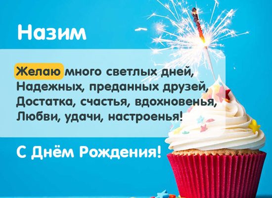 Поздравьте ваших друзей и родных в День Рождения с помощью поздравительных оригинальных открыток с именем Назим от онлайн-портала Клонатор.ру. Вы можете подобрать подошедшую из сотен поздравительных картинок, которые подойдут под любой вкус и отношения. В нашем собрании есть картинки для детей и взрослых с именем Назим. Любую картинку можно скачать бесплатно на телефон и подарить близкому человеку, чтобы поздравить с юбилеем, или Днём Рождения.