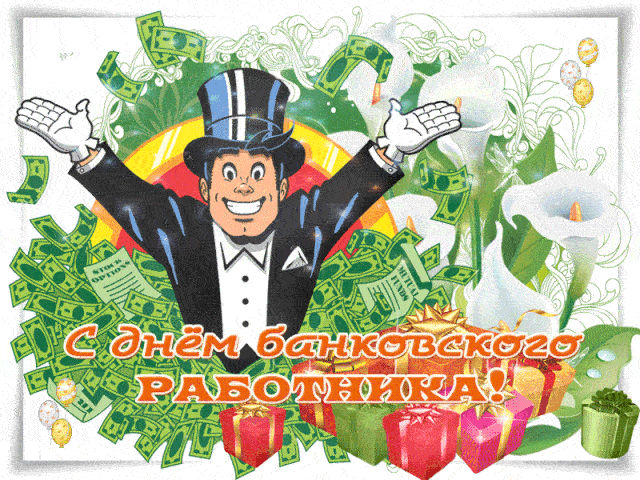 Красивые и прикольные картинки, мерцающие живые гифки с Днём Банковского работника, с душевными словами, чтобы замечательно поздравить работника банка в его профессиональный праздник. Все открыточки и анимашки можно скачать бесплатно и отправить получателю на мобильный в какой угодно мессенджер: Ватсап, Телеграм, Вайбер, или в социальную сеть: Вконтакте, Фейсбук, Одноклассники и т.д.