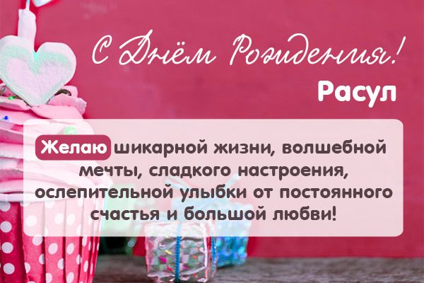 Обрадуйте ваших друзей и близких в День Рождения посредством красивых авторских картинок с именем Расул от сайта «Klonator.ru». Вы можете выбрать подошедшую из сотен прикольных открыток, которые подойдут под любое настроение и дизайн. В прекрасном сборнике вы скачаете картинки для детей и взрослых с именем Расул. Каждую открытку допускается скачать бесплатно на мобильный и отправить любимому человеку, чтобы поздравить с юбилейной датой, или Днём Рождения.