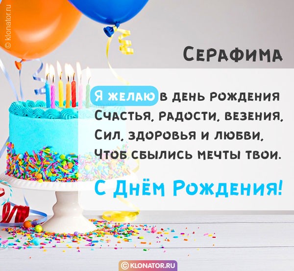 В скором времени Днюха лучшей подруги? Наступает Юбилей близкого человека? Не волнуйтесь — у нас на портале klonator.ru вы найдете торжественные открытки с именем Серафима, которые приглянутся любому имениннику. Красивые и милые поздравительные картинки подойдут всем: однокурснице, внучке, женщине, ребёнку, знакомой, девушке, любимой, золовке, руководителю, тёще, свекрови, крёстной, девочке, приятельнице, любовнице, однокласснице, коллеге, невестке, сестре, куме, воспитателю, начальнице, преподавателю, тёте, подруге. Отправьте их на мобильный, или расположите на форуме, или блоге — коды для вставки мы приготовили для вас.