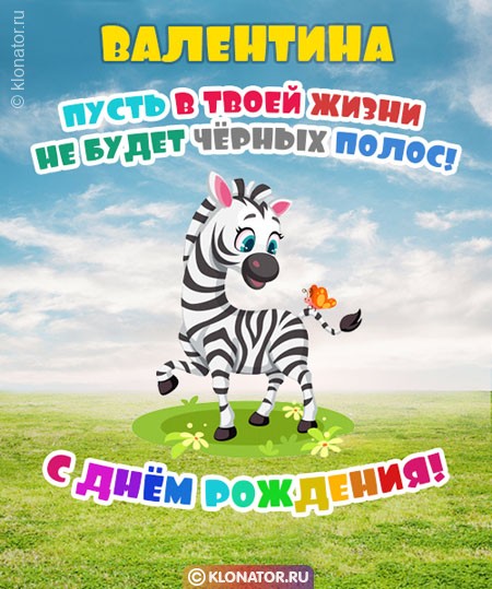 Очаровательные открытки и звуковые пожелания с именем Валентина от веб-сайта Klonator.ru вы можете молниеносно отправить на смартфон друзьям в: телеграмм, ватсап, вайбер. В нашей коллекции праздничные открытки с Днём Рождения и Юбилеем: презентами, воздушными шарами, для детей, с надписями, тортами, смайликами, тюльпанами, котами, цветочными букетами, поздравлениями в прозе, шоколадками, с цветами, мягкими игрушками, от Ди Каприо, медвежатами, открытки от Путина, розами и попросту очень качественные.